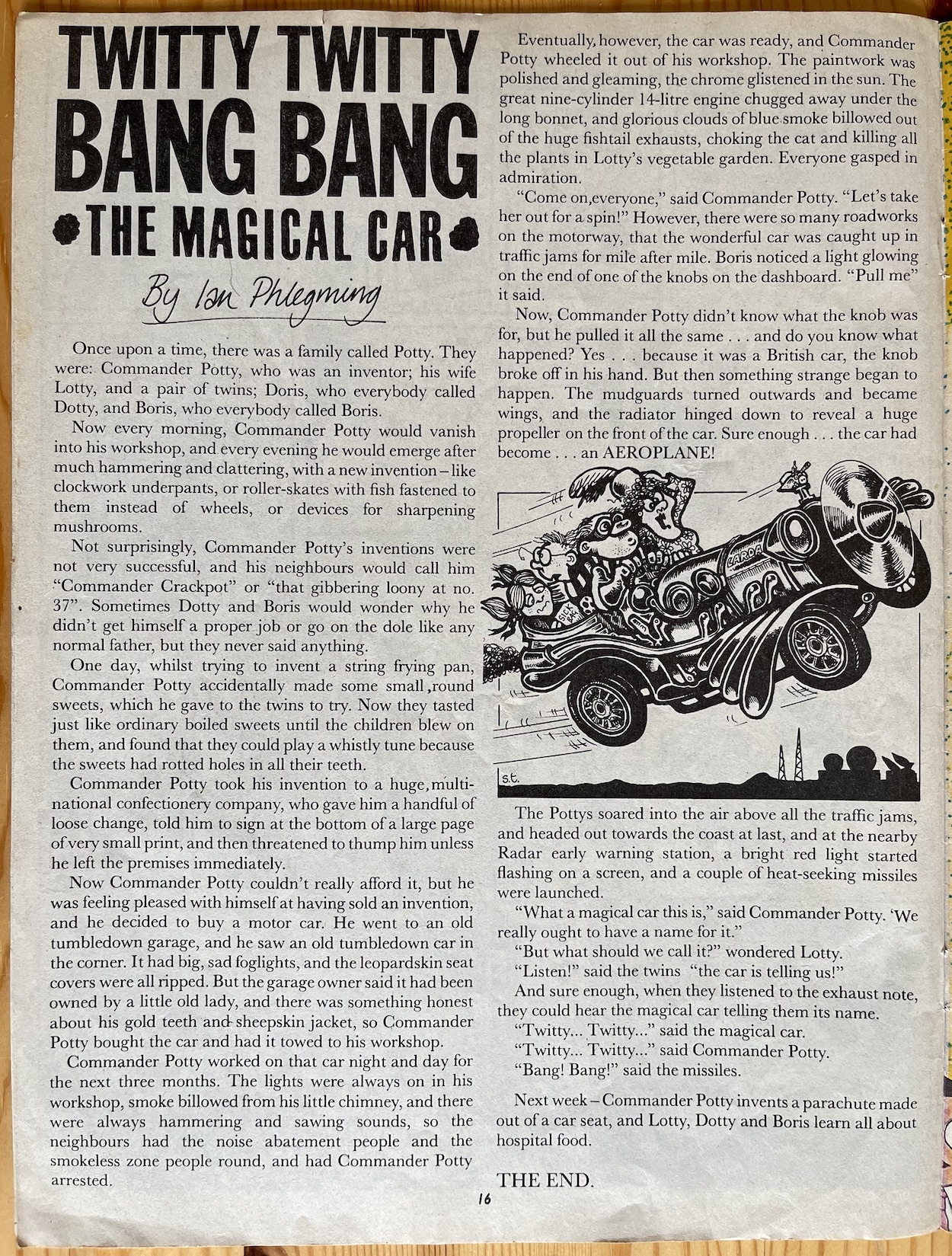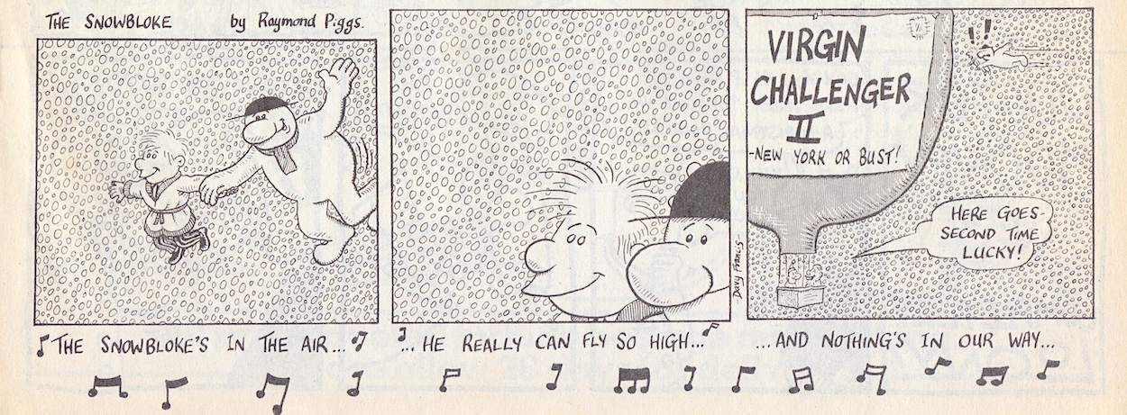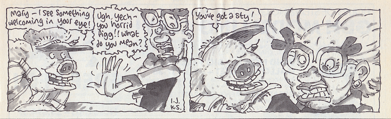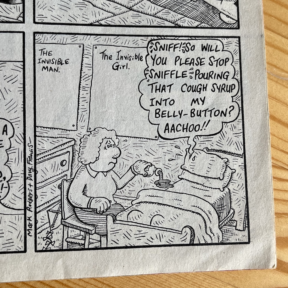 I think this is all the funnier knowing now that’s real-life partners Helen and Mark. Playing on the expectations of those typical love photo-stories found in women’s weekly magazines (which have been a target since the very beginning of OiNK) I love how Helen’s acting is deemed to need a large arrow telling the reader what she’s portraying, plus her goofy look in the panel below. This must’ve been so much fun to produce.