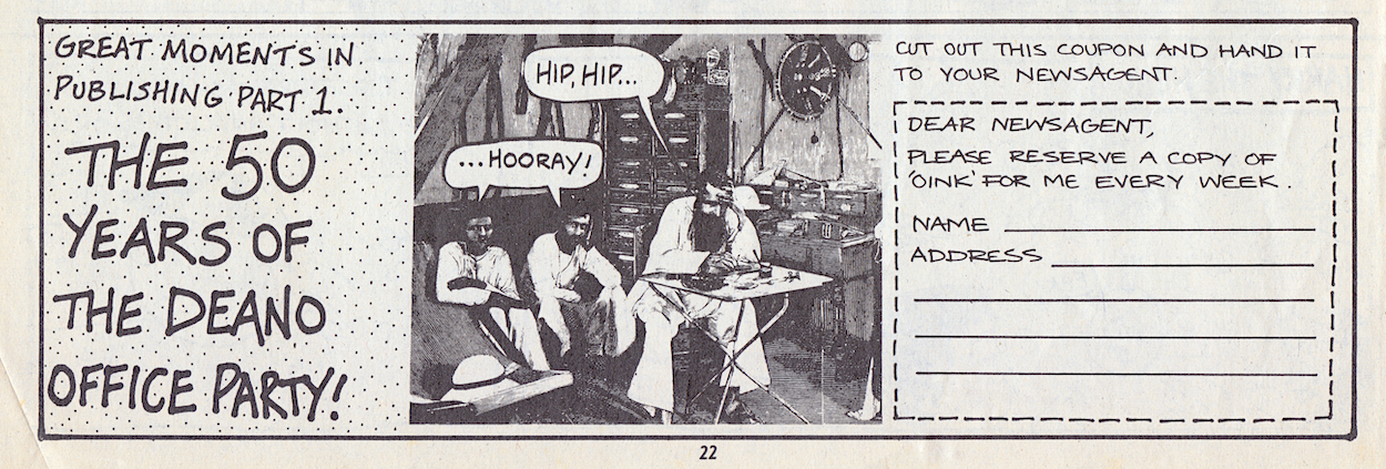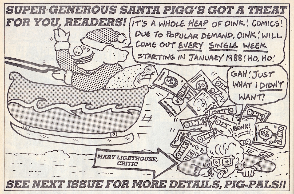 While OiNK would take another issue or two to truly settle into its new guise this issue has still been a belter. As more and more gets created with the new look in mind we’d see bigger and better strips from all of our favourites and some truly memorable moments that are among the very best OiNK produced. The Next Issue promo in this issue elicited real excitement too when it signalled the return of The Street-Hogs at last in ‘Malice in Underland!’ You’ll see that promo in the preview post on Thursday 13th July 2023, swiftly followed by the review of #65 itself on Sunday 16th.