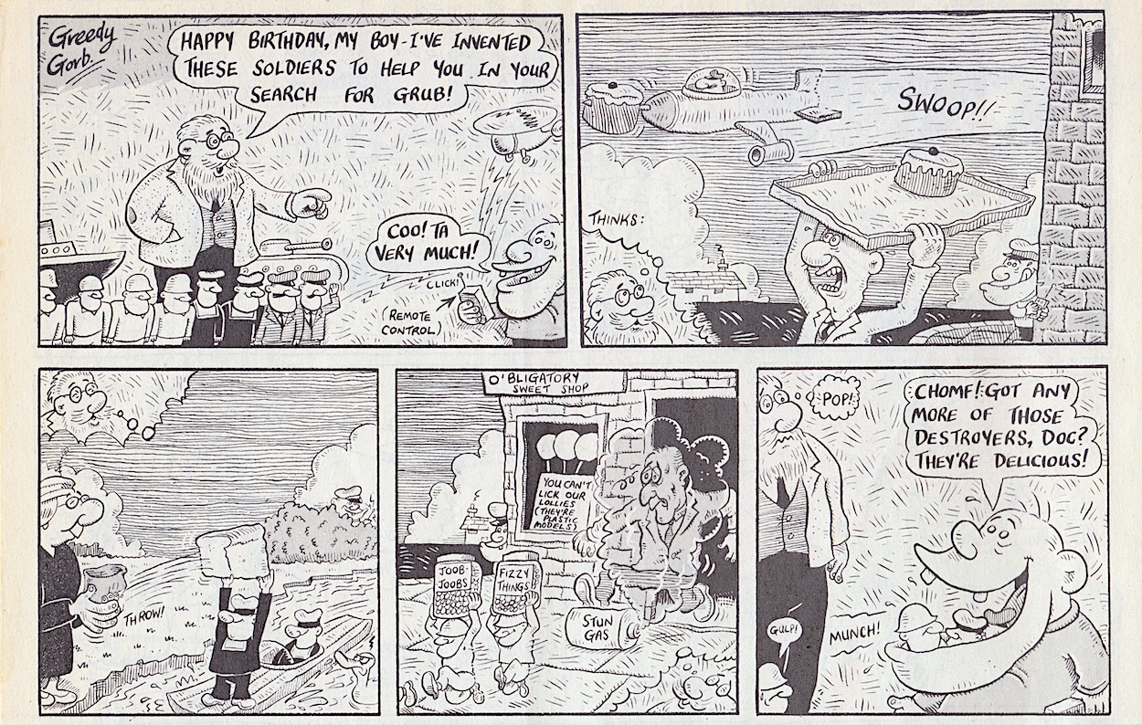 Davy Francis’ Doctor Mad-Starkraving (a spin-off from Davy’s Greedy Gorb) tells a great gag that in hindsight is actually the most obvious time travel joke! It’s just that no one had thought it up yet. An instant classic gag from Davy then. Finally, Marc’s zany characters in When Dinosaurs Ruled the Earth make their final appearance in a new strip (they’d return next issue but as a reprint before disappearing) and they sign off with one of their best entries.