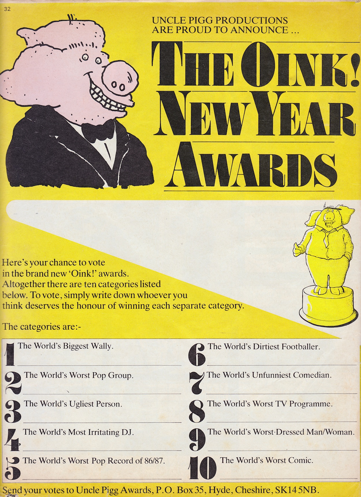 Here’s the back page before we finish off. The team decided to run their own awards, mimicking the likes of the Oscars and BAFTAS, the hype for which always begins as soon as each new year does. But this wouldn’t be just any old awards. We weren’t being asked to vote for our favourite characters or cartoonists from within OiNK’s pages, oh no. Biggest Wally, Worst Pop Group, Most Irritating DJ and even Worst Comic. This would be fun to take part in.