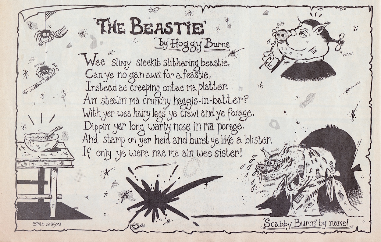 I mentioned Scottish culture earlier and we can’t do that without mentioning Robbie Burns, surely? OiNK thought so. The comic just had in Burp and it’s not finished with him yet. The poet’s work is described as “spontaneous and direct” and it fell upon Steve Gibson to conjure up a suitable parody. He knocks it out of the park. Taking Burns’ To A Mouse as his inspiration he renames it The Beastie. Complete with typical Gibson art, unmistakable in the beastie itself, here’s Hoggy Burns.