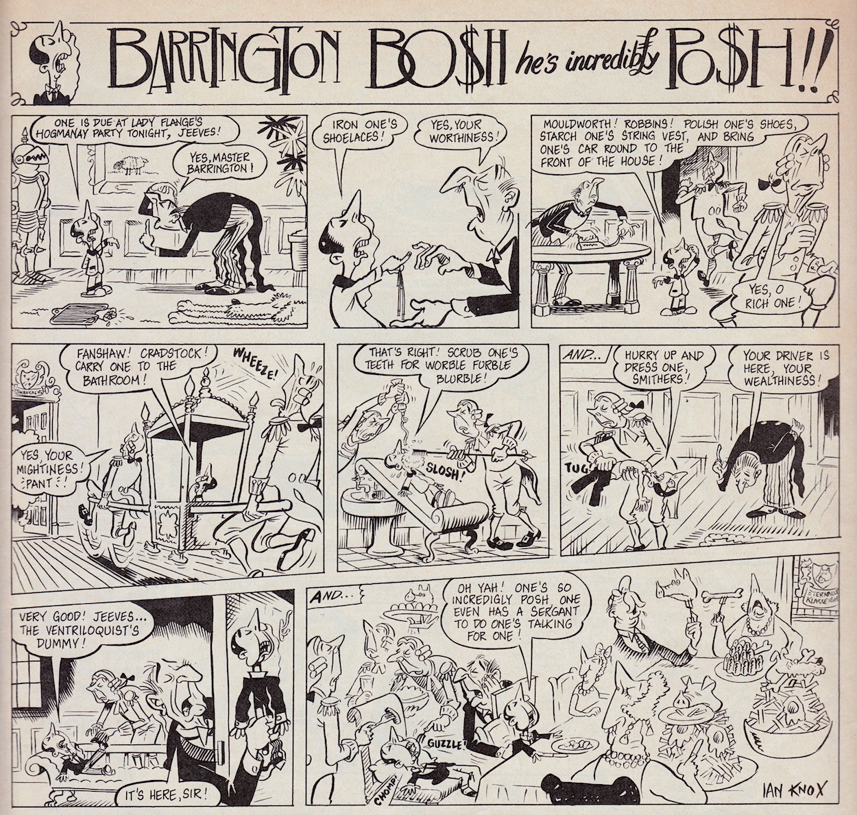 A new character who might like to think he’s cultured is new addition Barrington Bosh he’s incredibly Po$h, brought to the page by fellow Northern Irelander Ian Knox. Given how much I remember of this particular posh little git I was surprised to find out he only appeared in nine issues of OiNK altogether, normally with long gaps between strips. To say he was posh is actually a huge understatement, the whole point being to push this to the extreme every time. This debut story is the perfect introduction.