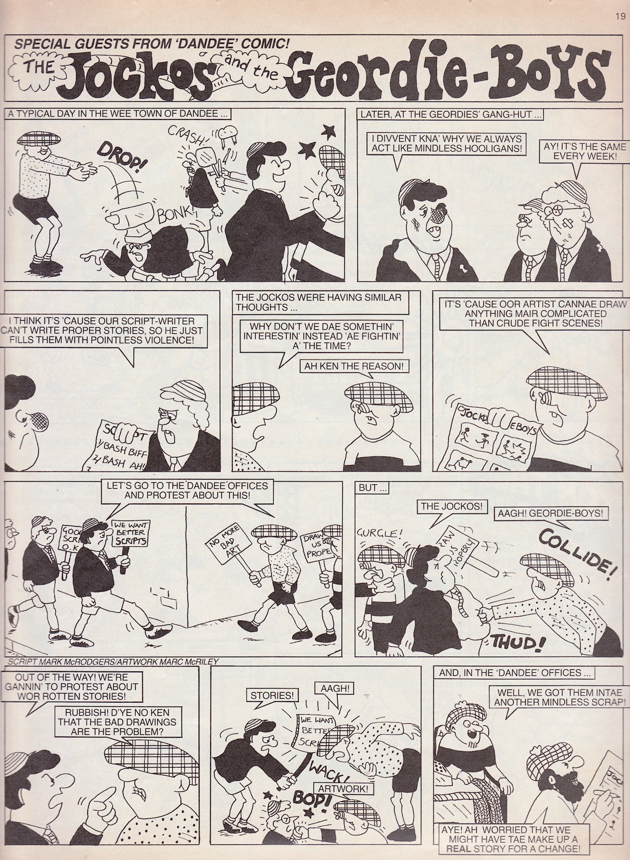 I’ve said it before and I’ll say it again, nothing was sacred to OiNK. This was especially true when it came to those bastions of the comics world, the unstoppable forces of The Dandy and The Beano (well, at least Beano is still unstoppable). A favourite target of Uncle Pigg’s, the two comics were held in high regard by co-editor and head writer Mark Rodgers who had great fun in sending them up quite regularly. For the Scottish issue there was no better strip ripe for this treatment than The Dandy’s Jocks vs Geordies.