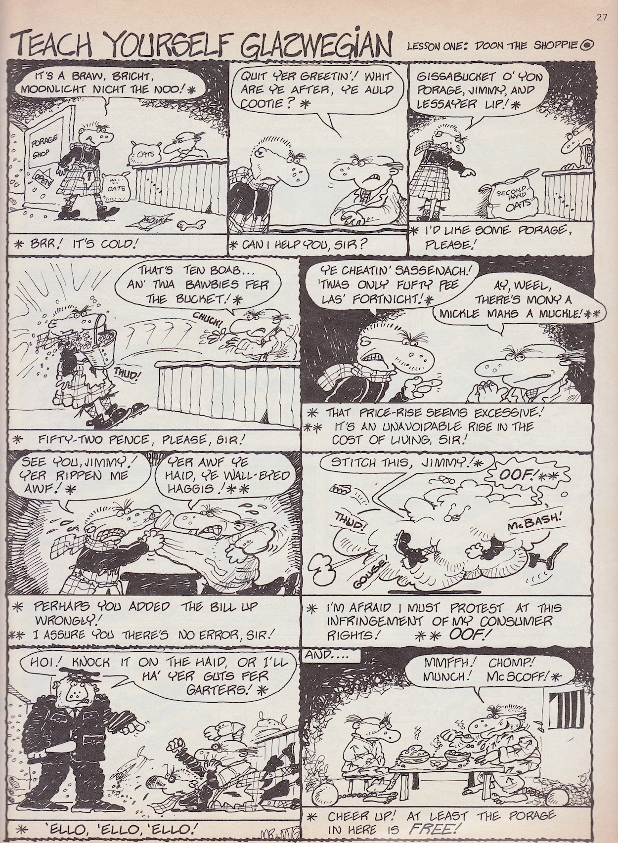 I have a soft spot for Scotland most definitely but at age nine I wasn’t aware of most of these real places, however it was no less funny. You’ll have spotted some of the best gags come from Hadrian’s grasp of Scottish words. Just a little later in the comic Mark took this a step further with a full page dedicated to helping the readers Teach Yourself Glaswegian, drawn by Mike Green.