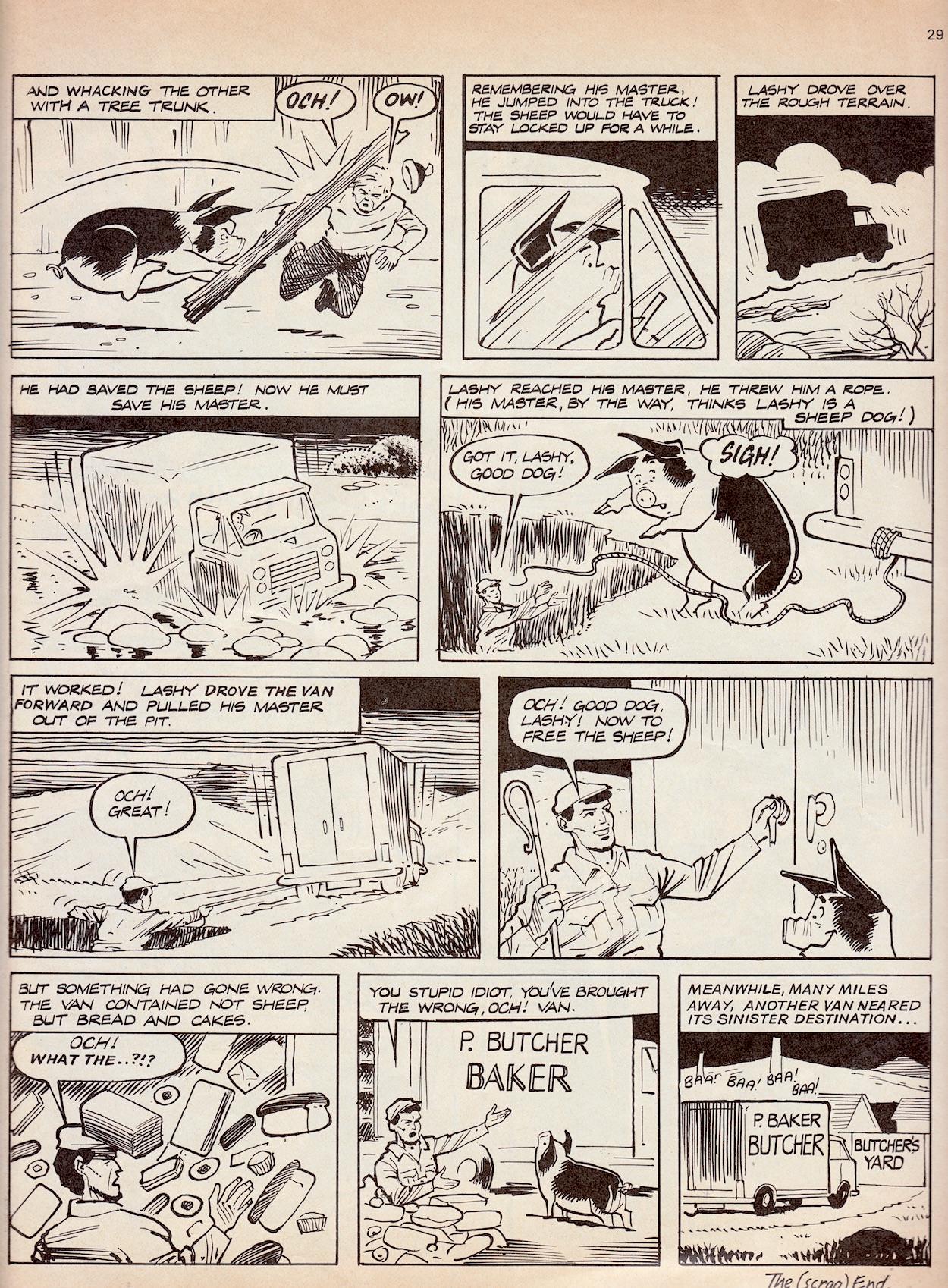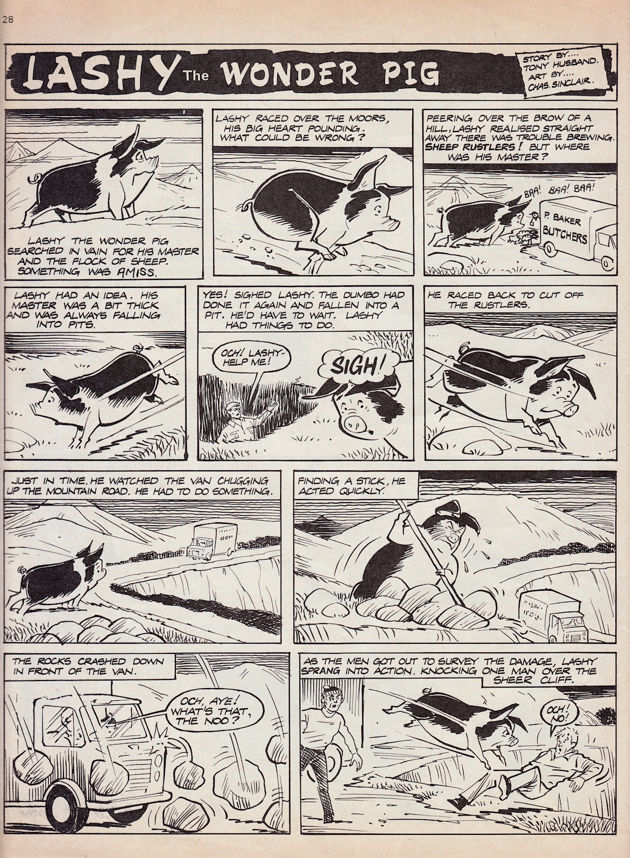 We’re down to the final few pages and I’ve broken away from the subject matter to show you the first entry in a semi-regular series of comedy adventure strips. We all know which television series this was based upon which starred a famous dog. But take that dog, replace him with a pig, make his owner completely useless, exaggerate the already far-fetched skills of the animal hero and then have one more funny twist in the final panels. Written by Tony Husband and drawn by Chas Sinclair here’s Lashy the Wonder Pig.