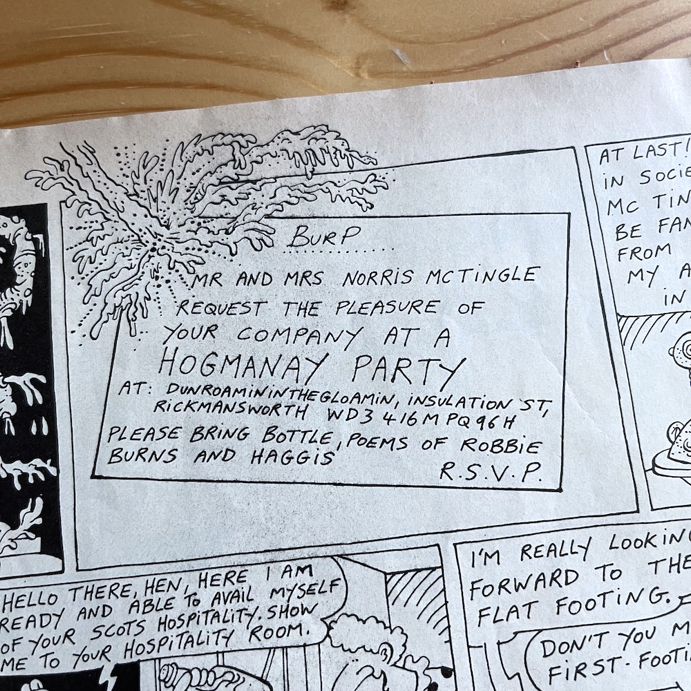 Before we move on to some of the multitude of Scottish strips and gags here are a couple of other highlights in this issue. As ever Burp has another strong entry and to be honest it’d be so easy for me to include his page in every single review. He’s been invited to a Hogmanay party and it all kicks off with this funny invite. One of Banx‘s other strips is the always hilarious Hector Vector and his Talking T-Shirt, though surely he should’ve had a coat on this time.