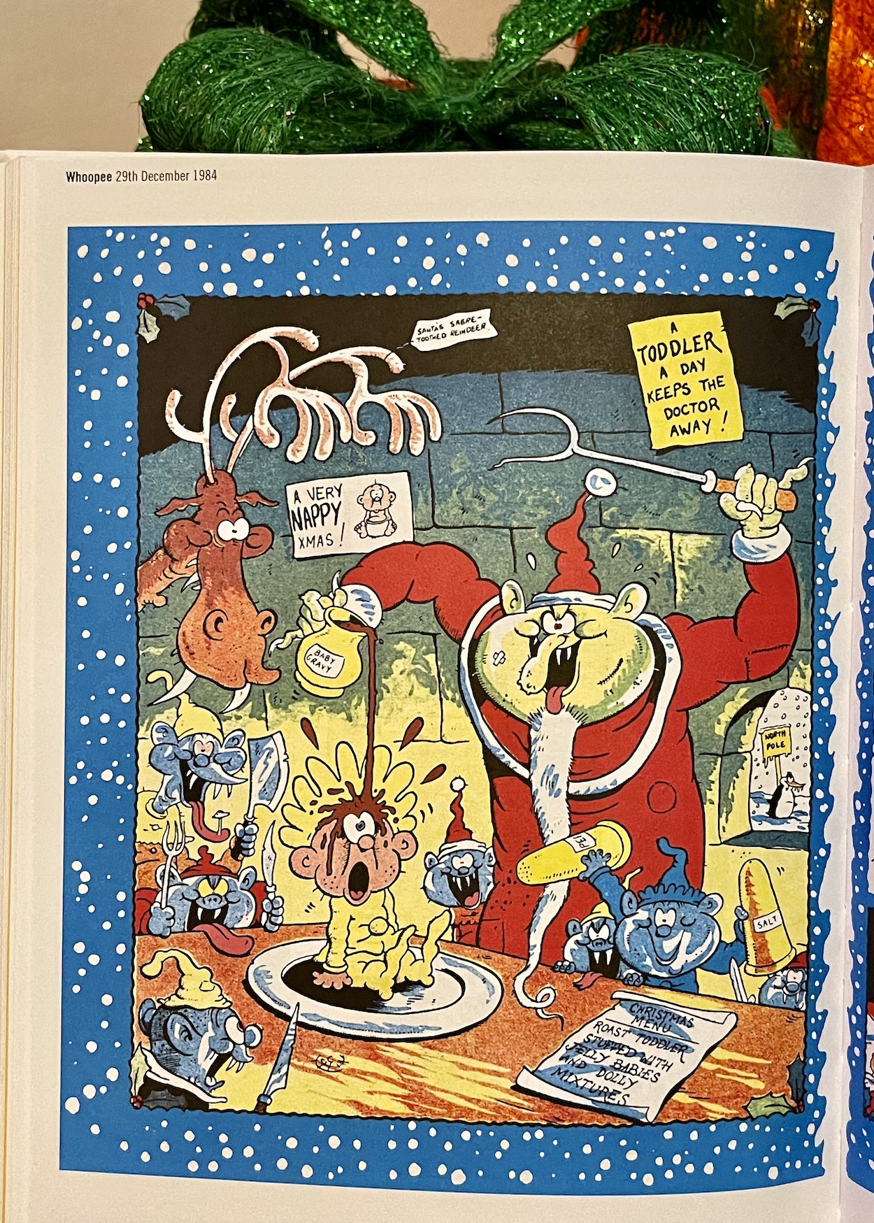 Pete, on the other hand, is in glorious full colour (coloured by John Michael Burns – thanks to Lew for the info). Alas, this doesn’t mean readers could be made even more squeamish with some technicolour pimple bursting. As I’ve mentioned before when the comics merged, given the younger audience it was decided the pus had to remain put. But that doesn’t mean the fun is kept bottled up. Here, that old OiNK classic of dressing up the pimple is taken to a hilariously Christmassy conclusion.