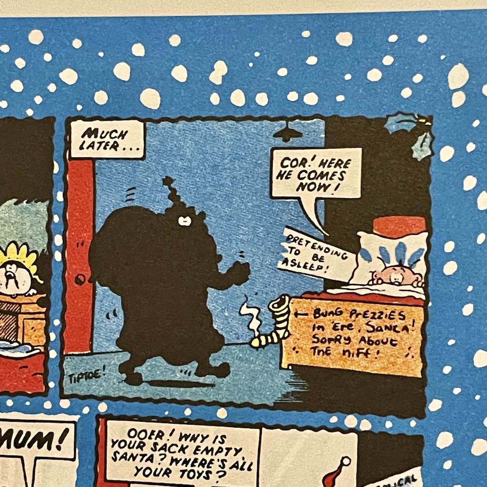 This wouldn’t feel out of place in OiNK itself. The simplest of tasks were always an epic struggle for Willy and going to see a slushy movie was no different, complete with the obligatory snow for the Christmas annual, albeit five snowflakes. It still counts. Surprisingly, it’s Pete and his Pimple who gets the full colour treatment on the deluxe paper rather than our next star.