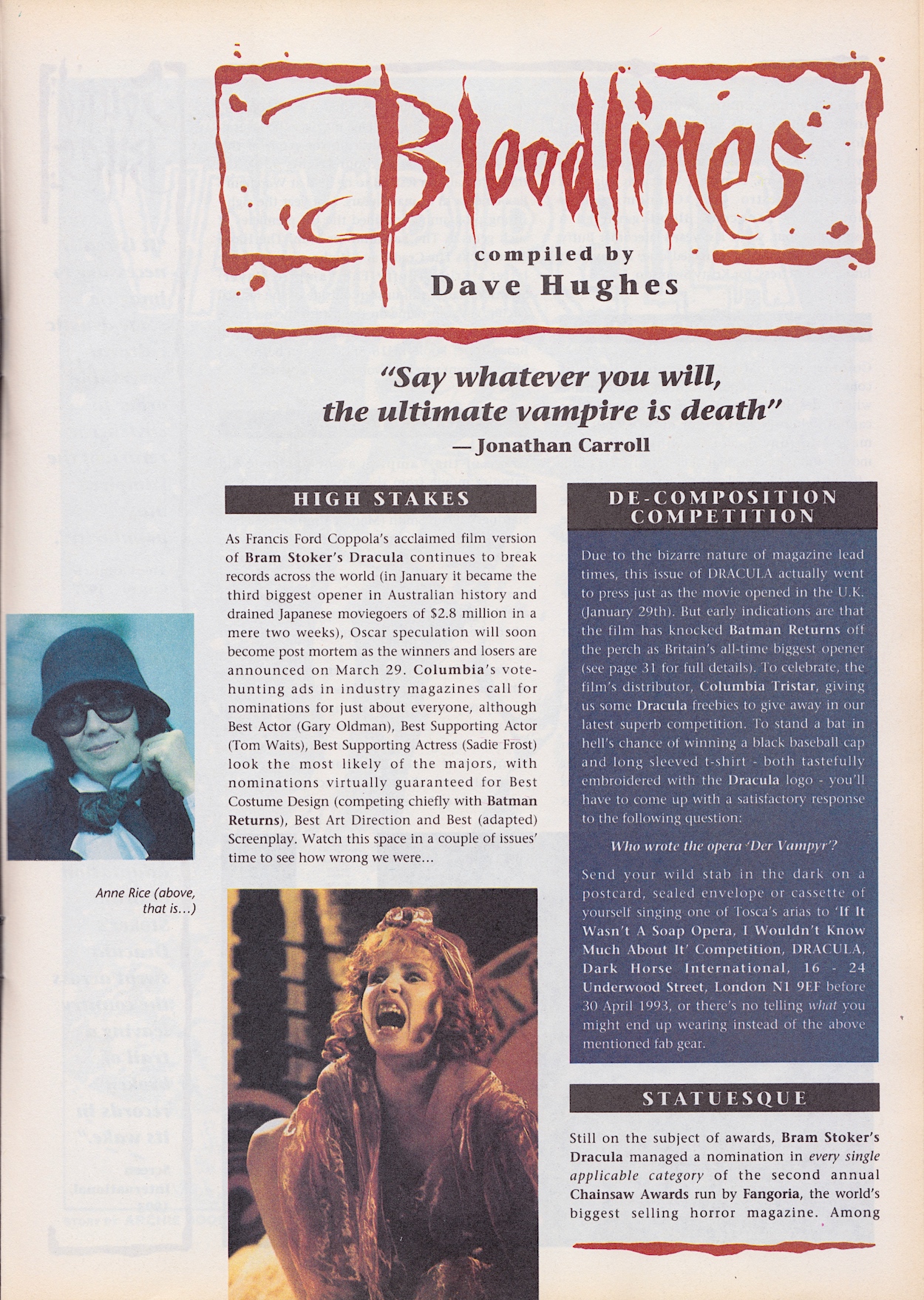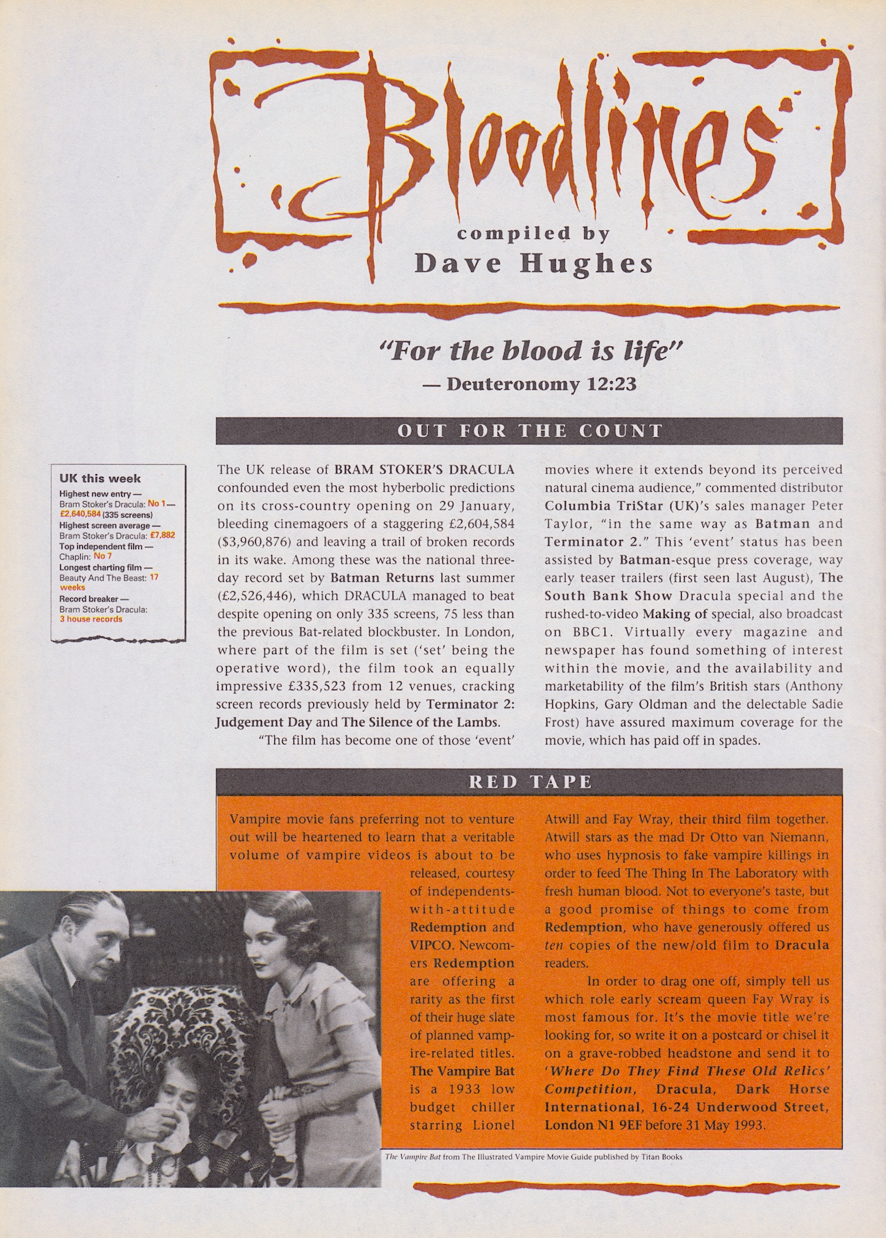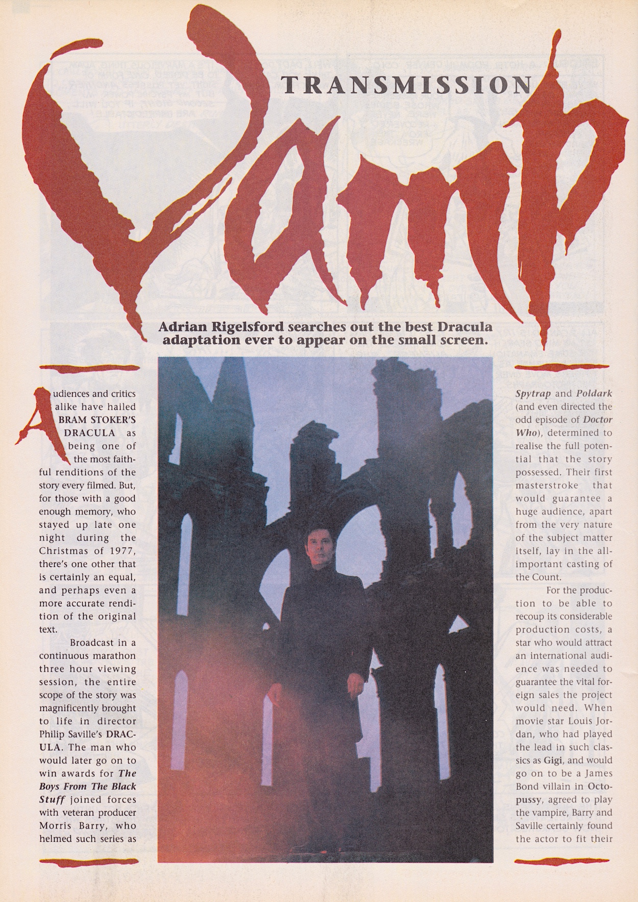 On to the Bloodlines news pages. The film was a “loose adaptation”? Oh dear, is Dave Hughes turning against the movie he hyped so much now that the comic is no longer a tie-in? Francis Ford Coppola’s movie updated the racist undertones of the original novel to modern sensibilities, but to describe it in this way is rather odd. I’d forgotten all about the fact the movie brought a brief resurgence in monster movies and I’d like to see Robert De Niro as Frankenstein’s monster, so that might be one for this Hallowe’en.