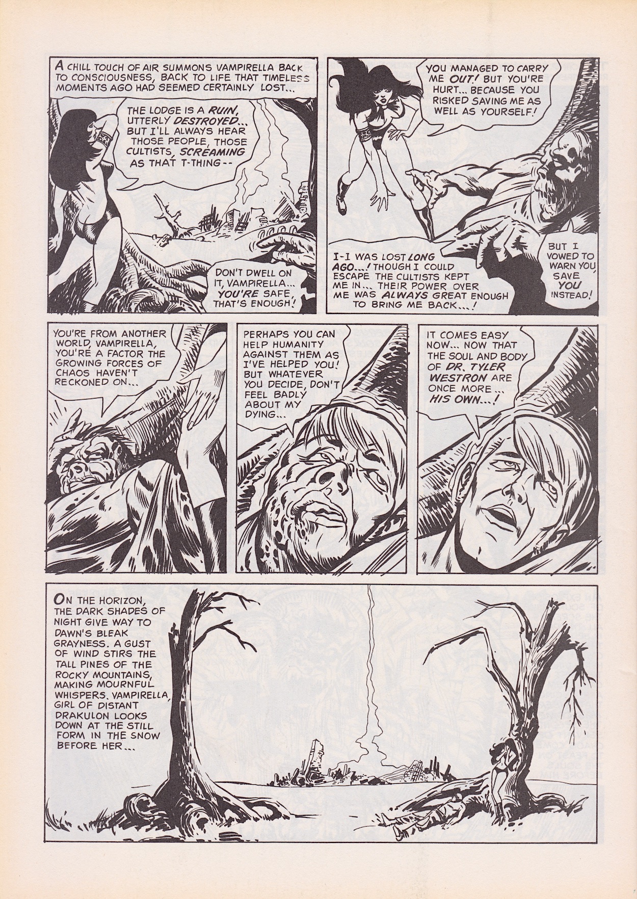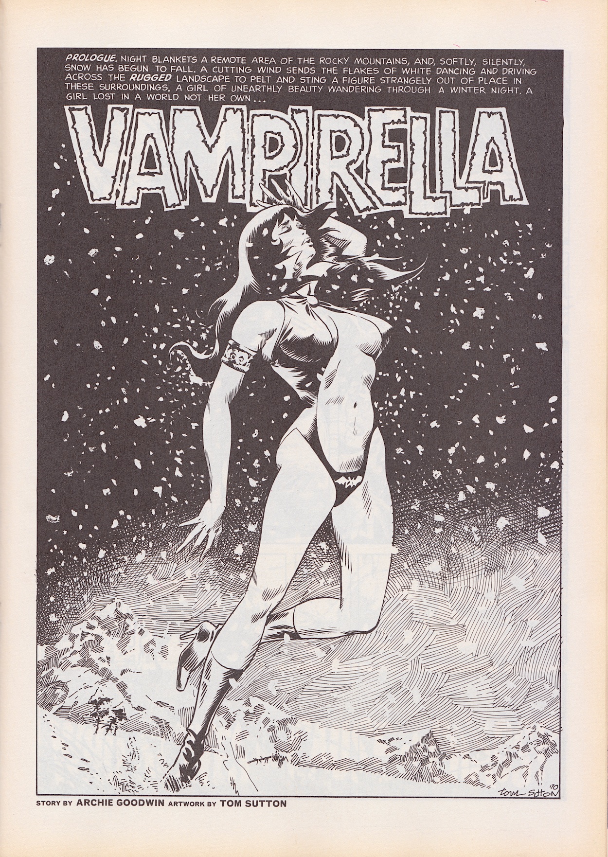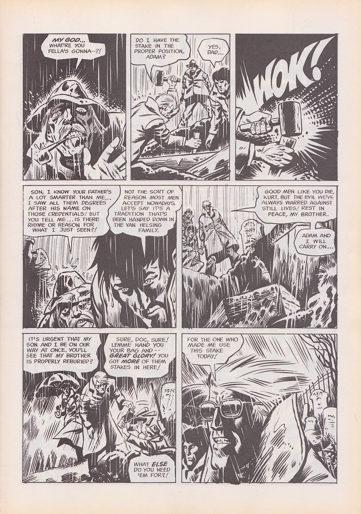 The Vampirella back up strip, still written by Archie Goodwin and drawn by Tom Sutton, sees Adam and Conrad Van Helsing (the latter of which is confirmed as blind) catch up with the alien vampire heroine but the younger Adam is incapable of killing her. We’ve seen hints that his newly developed psychic powers may be picking up clues as to her good nature but Conrad doesn’t want to hear it and fears she’s hypnotised him.