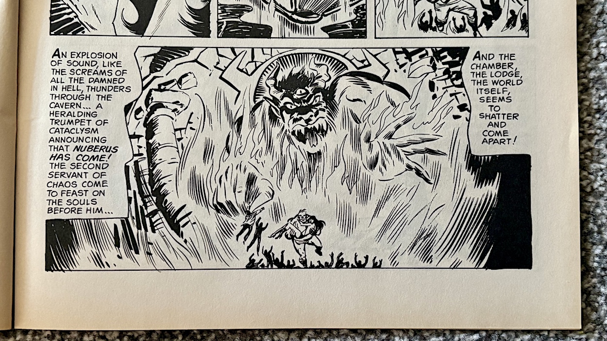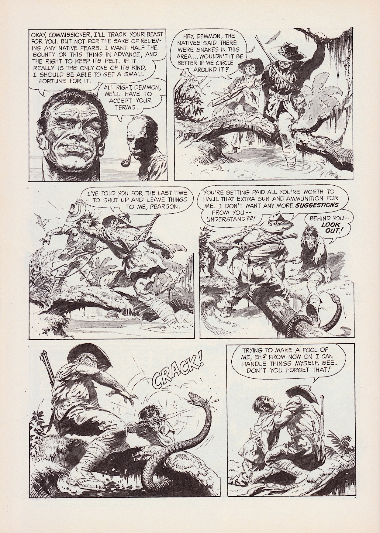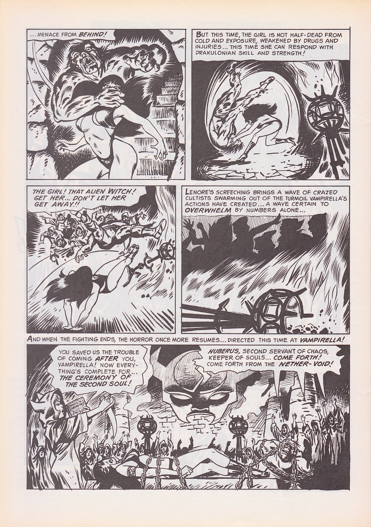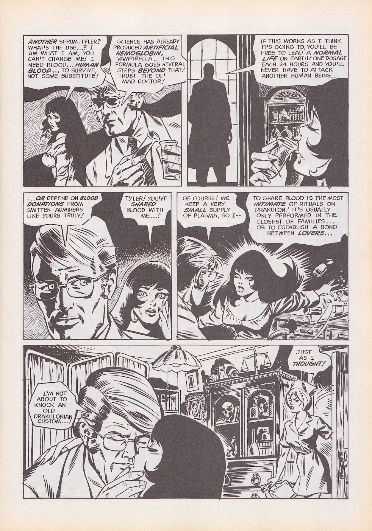 The Vampirella back up strip, still written by Archie Goodwin and drawn by Tom Sutton, sees Adam and Conrad Van Helsing (the latter of which is confirmed as blind) catch up with the alien vampire heroine but the younger Adam is incapable of killing her. We’ve seen hints that his newly developed psychic powers may be picking up clues as to her good nature but Conrad doesn’t want to hear it and fears she’s hypnotised him.