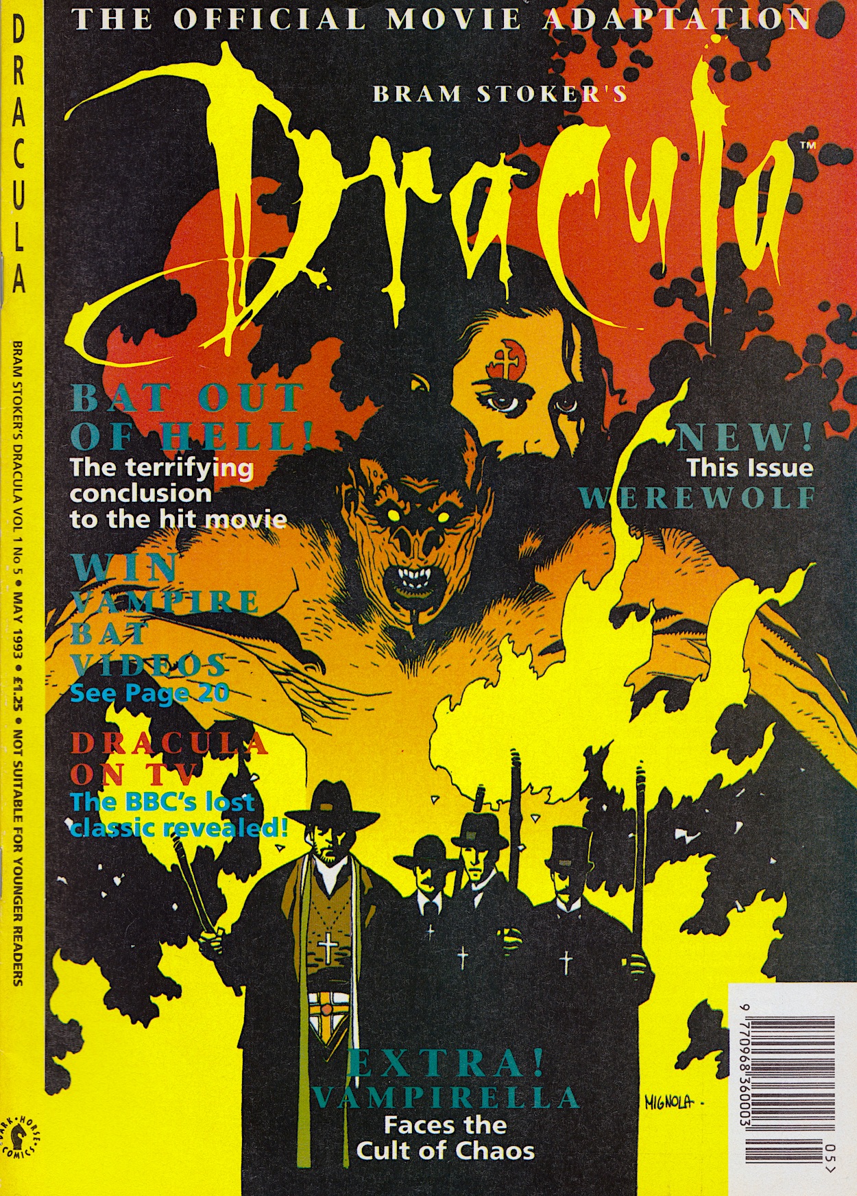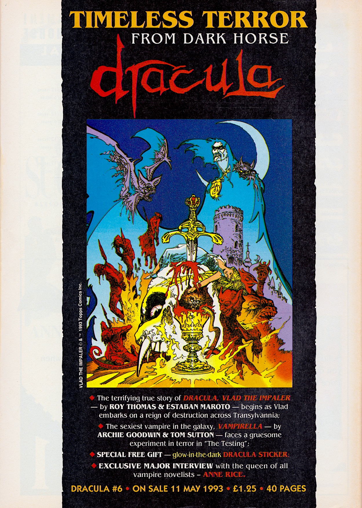 On this day back in 1993 came the seventh edition of Dark Horse International’s Dracula comic, now firmly in its post-movie adaptation stage. Irish artist Kilian Plunkett’s cover was unique to the UK comic, what with the issue containing part two of the same American issue of Topps Comics’ Vlad the Impaler from last month. Blog regulars should recognise the name too, as Kilian contributed the superb cover to #8 of Aliens in a completely different style.