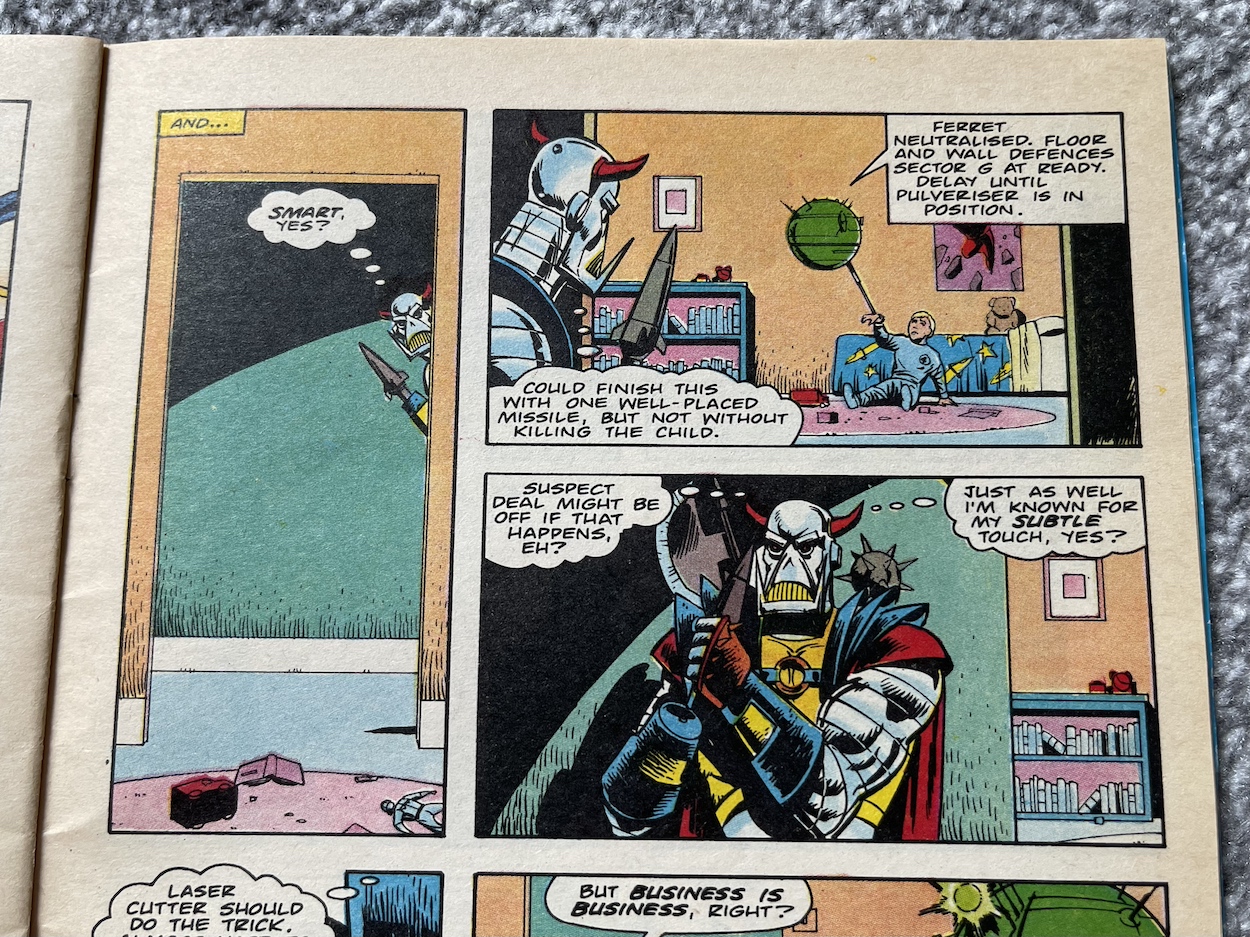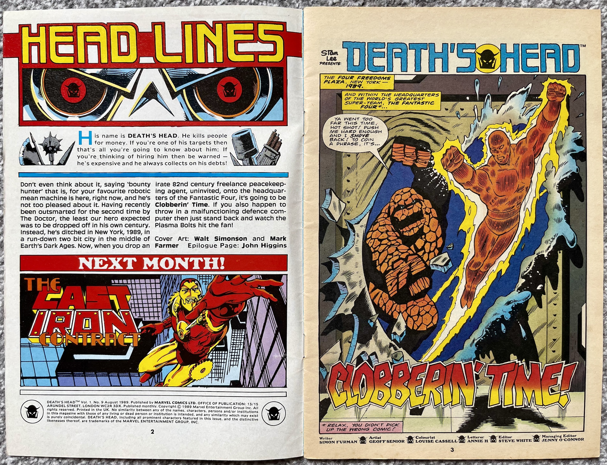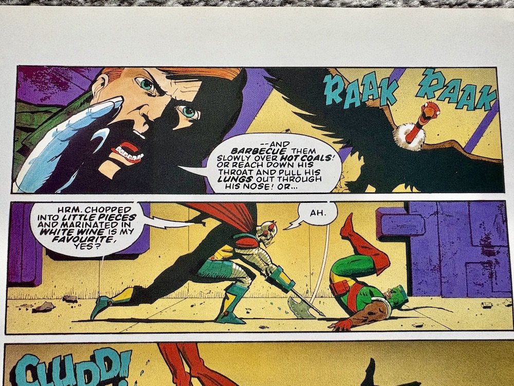 What definitely doesn’t gel for me is the retconning. Don’t get me wrong, I like stories that add to previous ones, that surprise us and take things in new directions or give us previously unknown facts to completely redefine characters and settings. But what I don’t like is when this completely contradicts what went before, and we’d already been told by Death’s Head himself he was created as the plaything of a very rich, very bored individual who he later killed.
