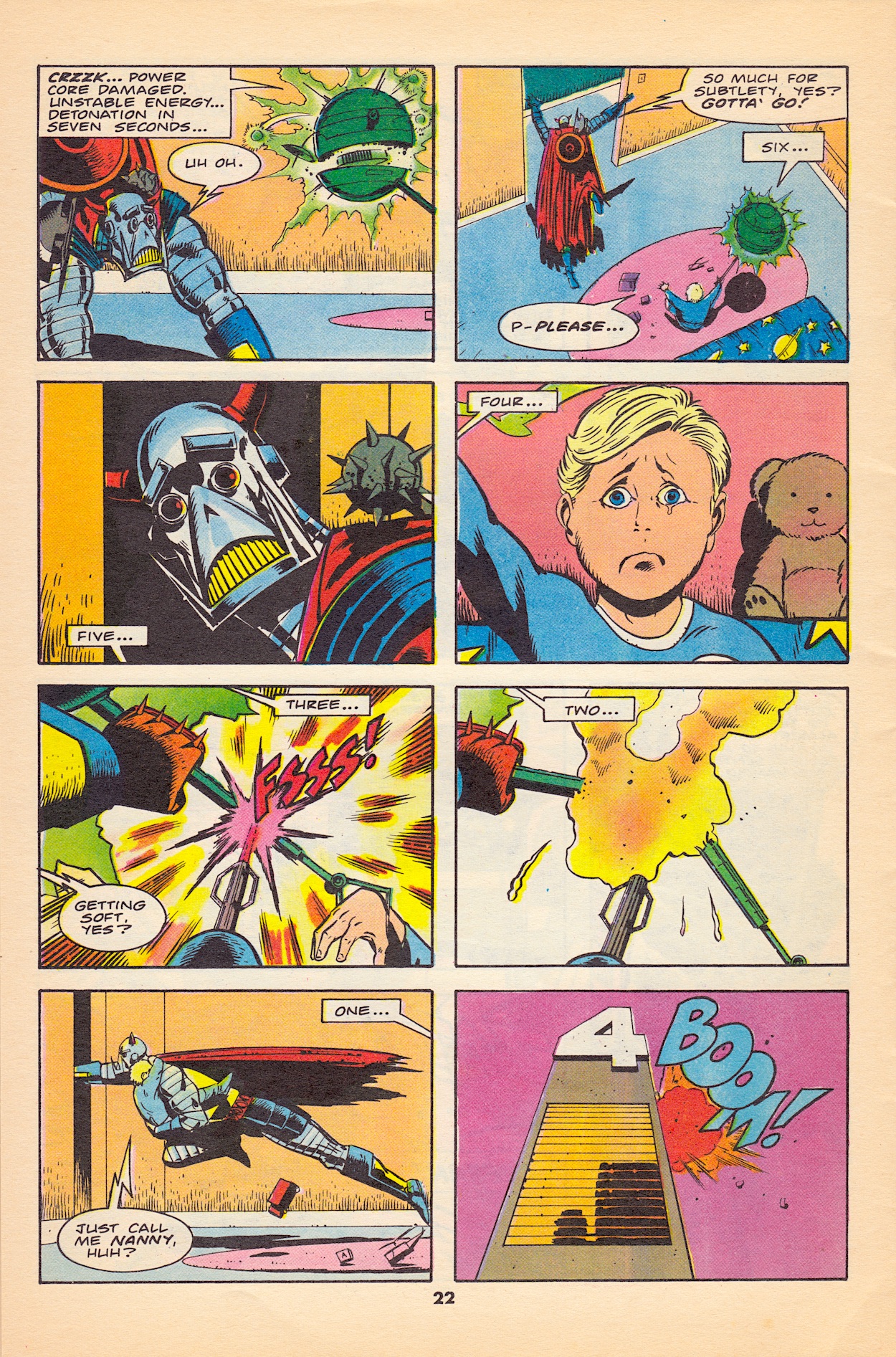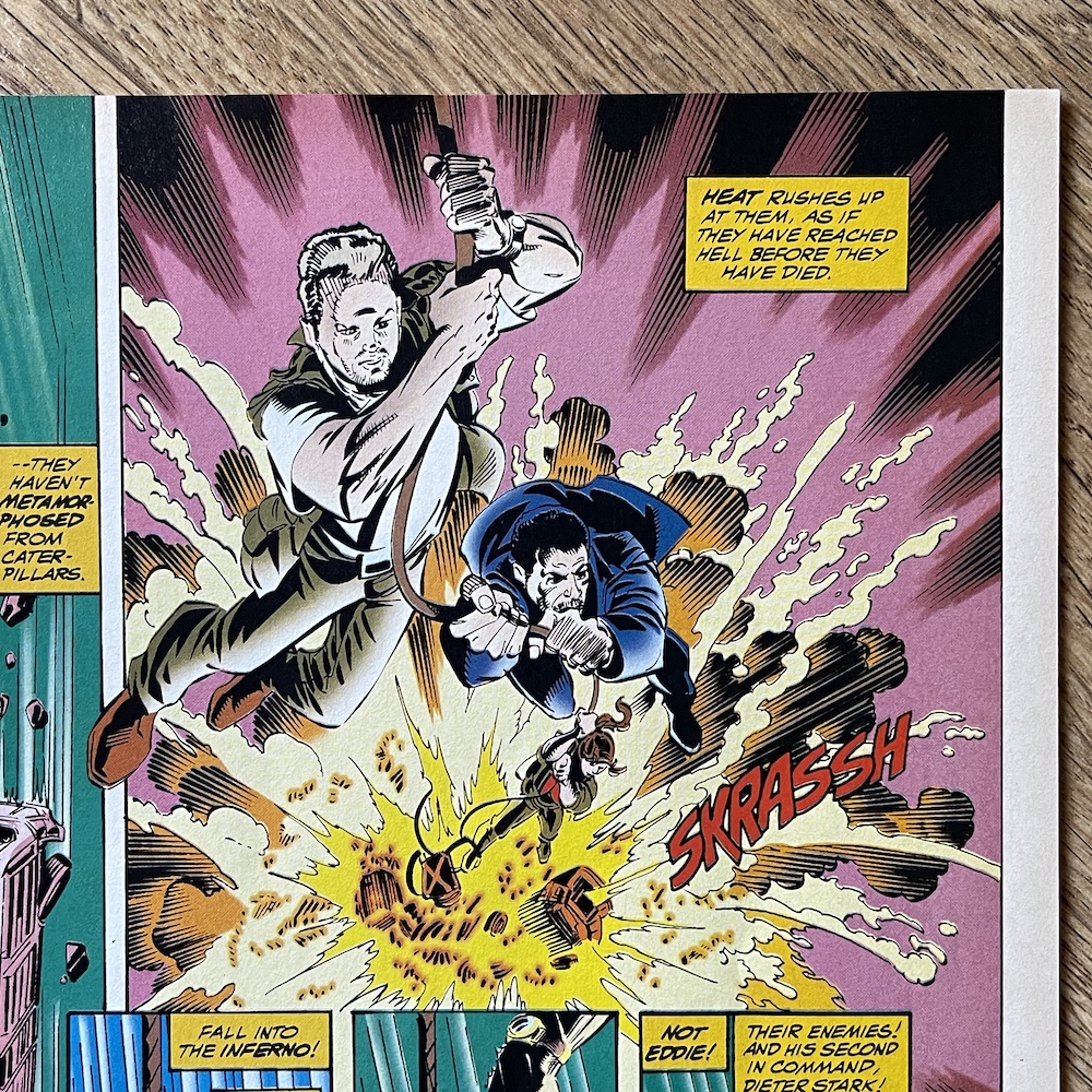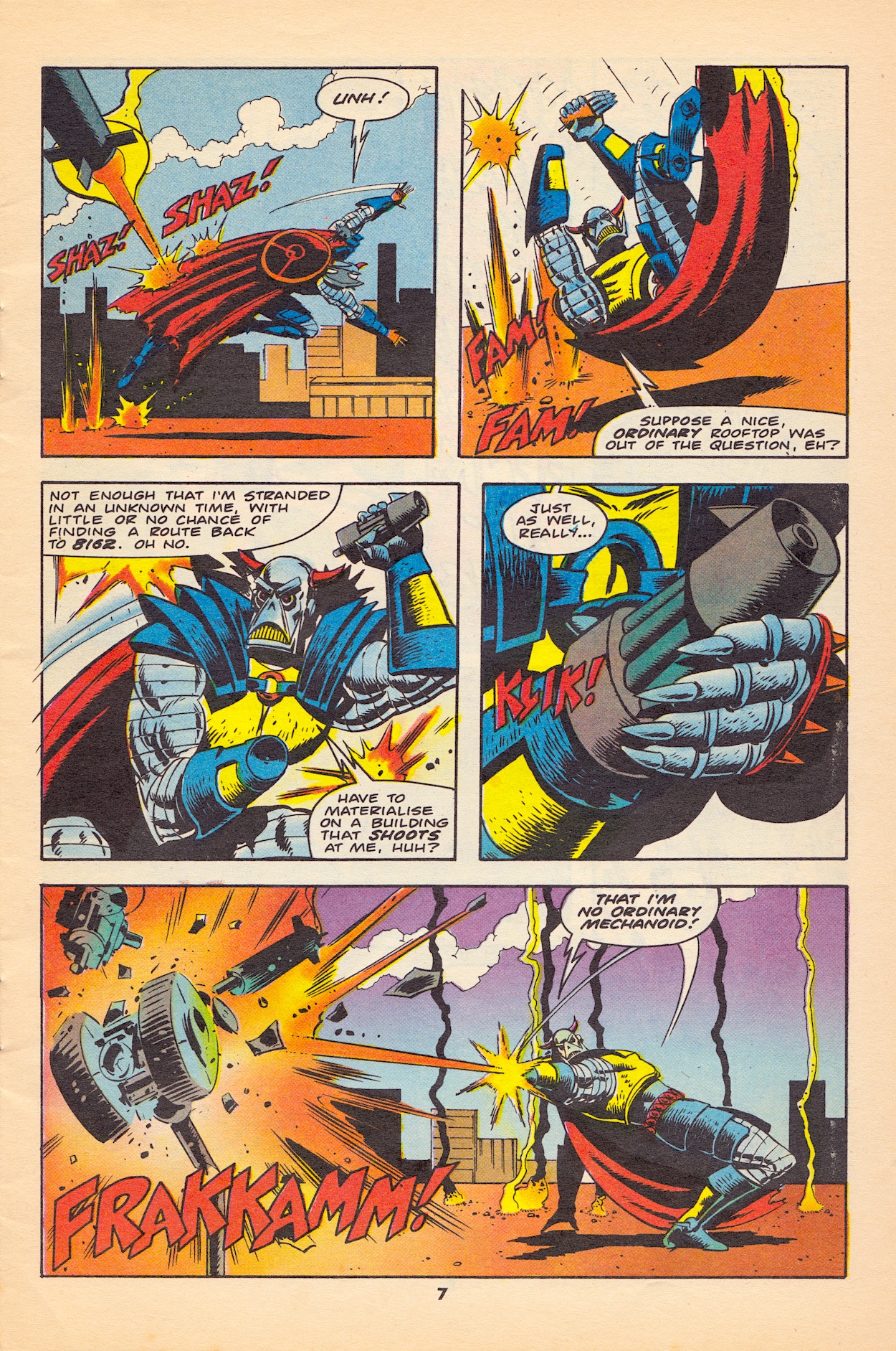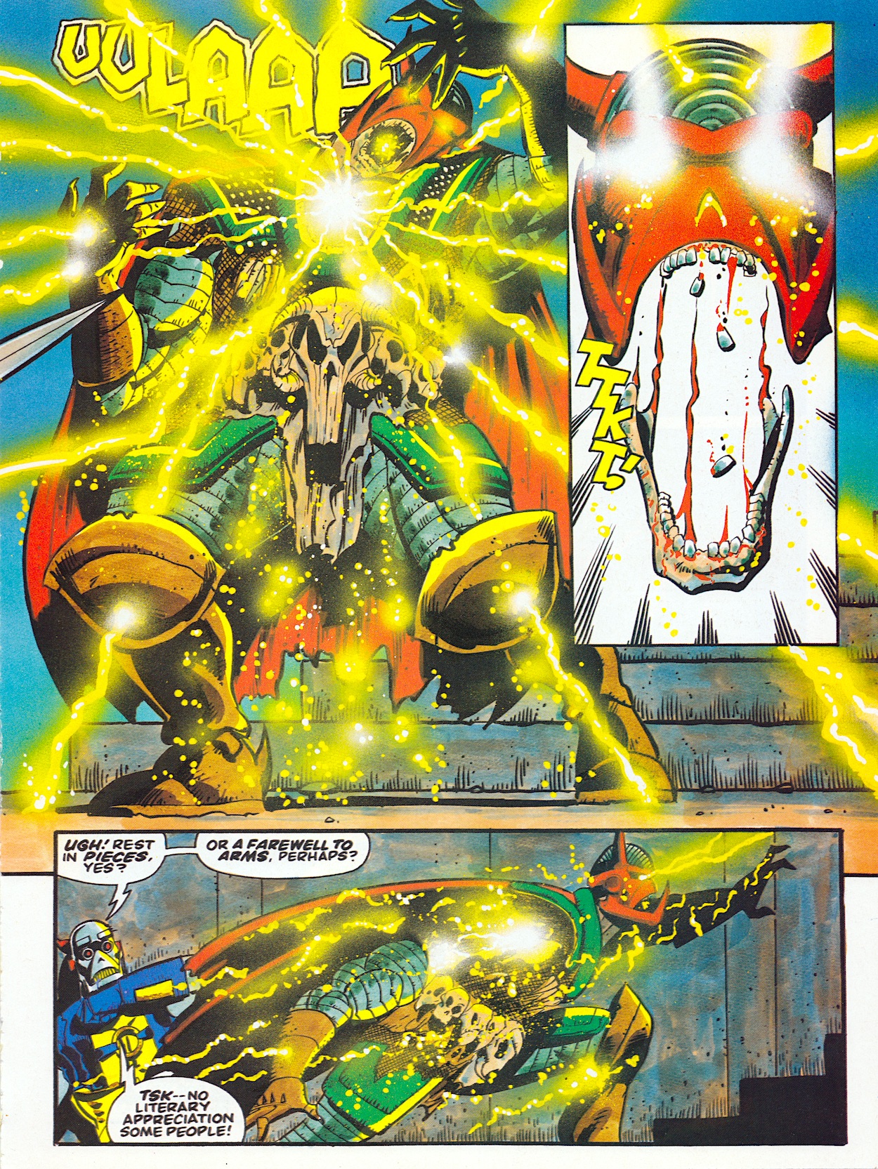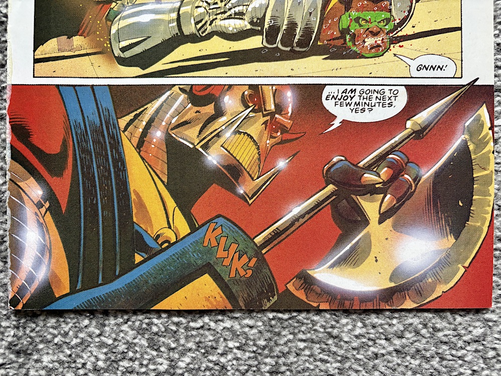 In the end Death’s Head takes a gamble that Lupex doesn’t know he’d spent so long in 8162 (in his own comic and Dragon’s Claws) and as a result has become much more advanced as he repaired and added to his tech. In the end he’s playing the victim but in reality his computer systems are calculating where a magik zone is about to change into a techno one. We think the final blow is about to fall but Lupex unknowingly tries to use magik as the zone changes and it no longer works. The few seconds it takes him to correct his attack is just enough for our star to use his built-in hidden spike.