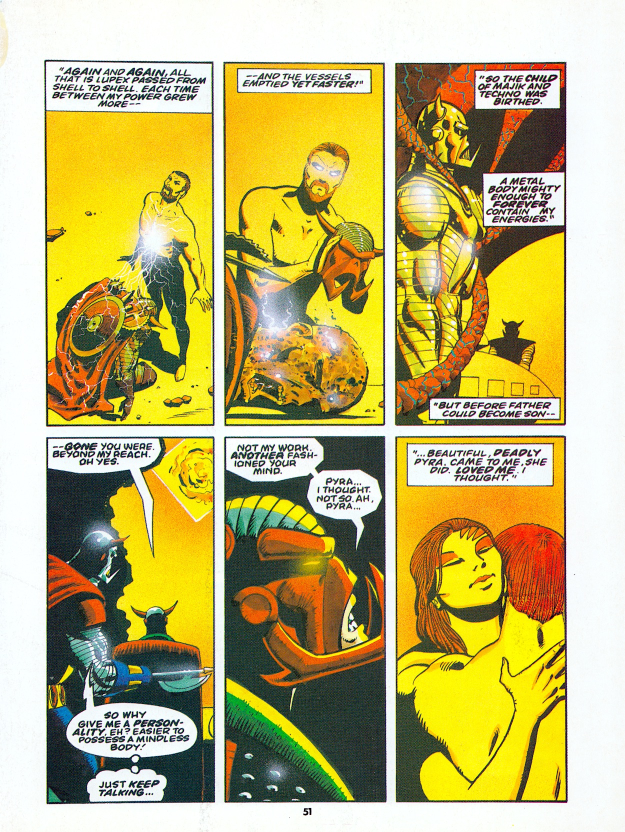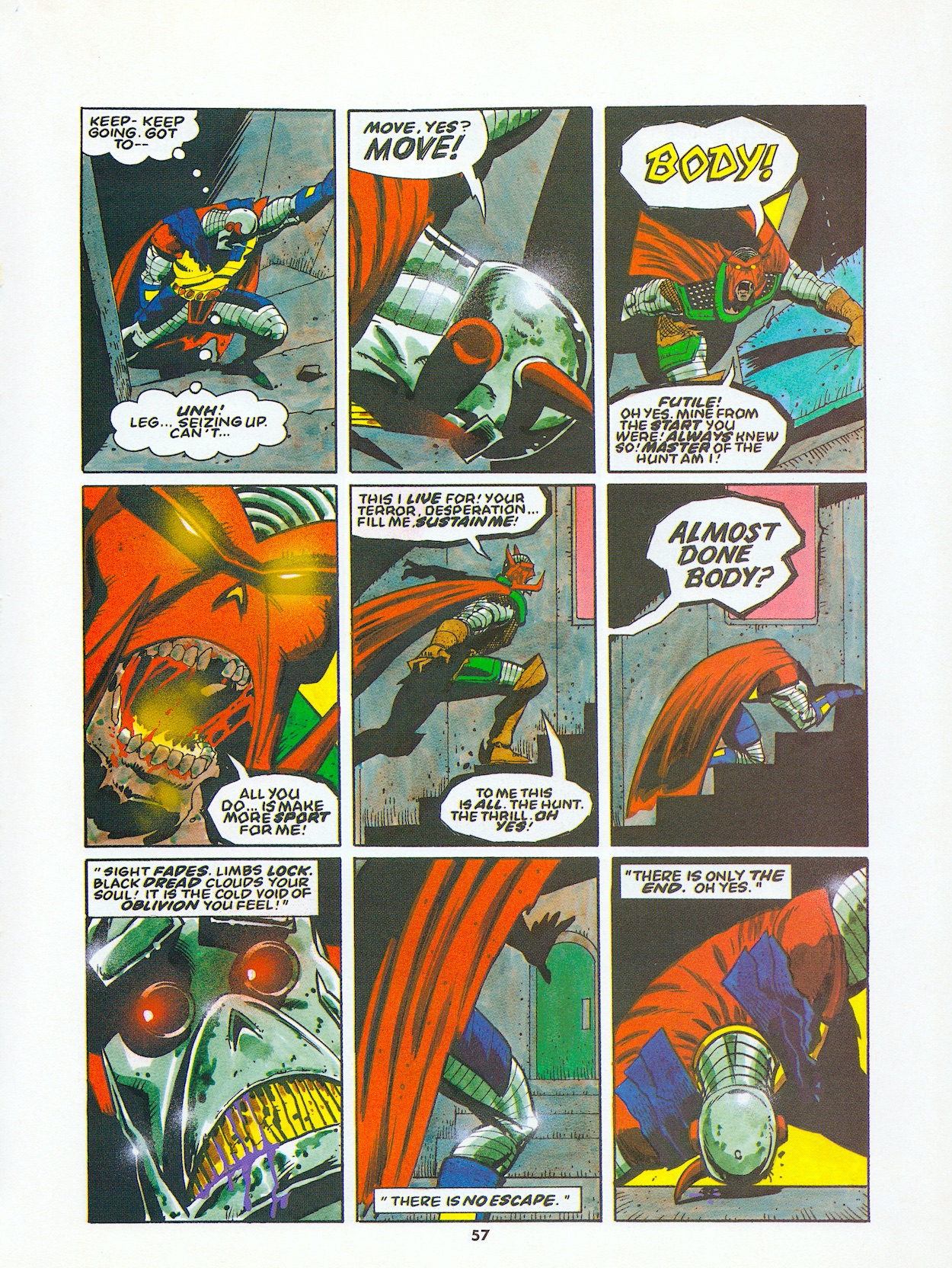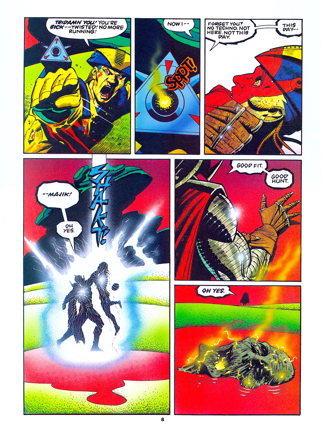 The story culminates in a chase echoing that from the beginning, only with Death’s Head as the one being chased and taunted. This creature also has control over the land in this realm, which is split into ‘magik’ and ‘techno’ sectors. In each he can realign his powers to shape the ground and use it to attack his victims, and he almost destroys Death’s Head by doing so. However, he cannot control the borders between these sectors or when they change from one to the other independently.