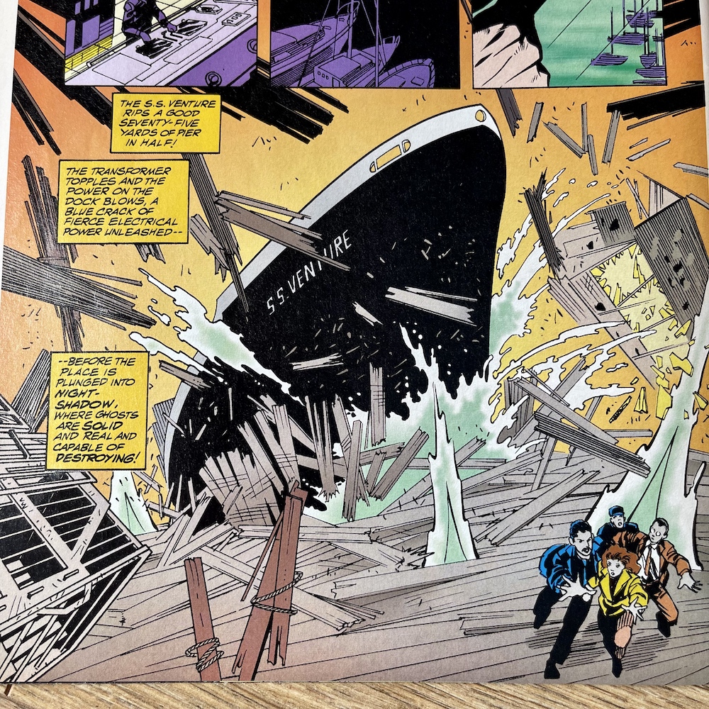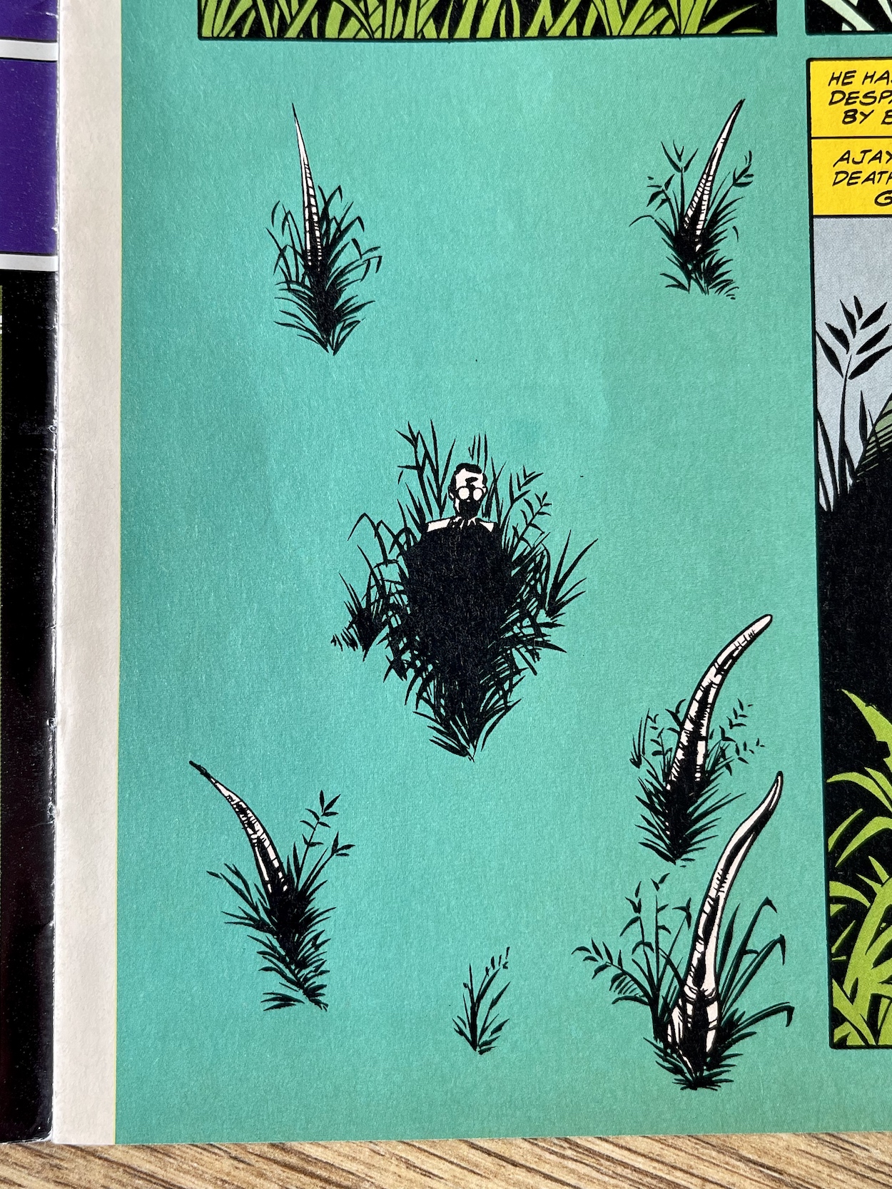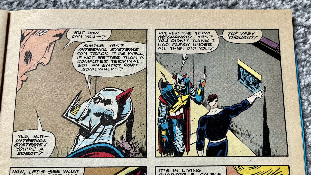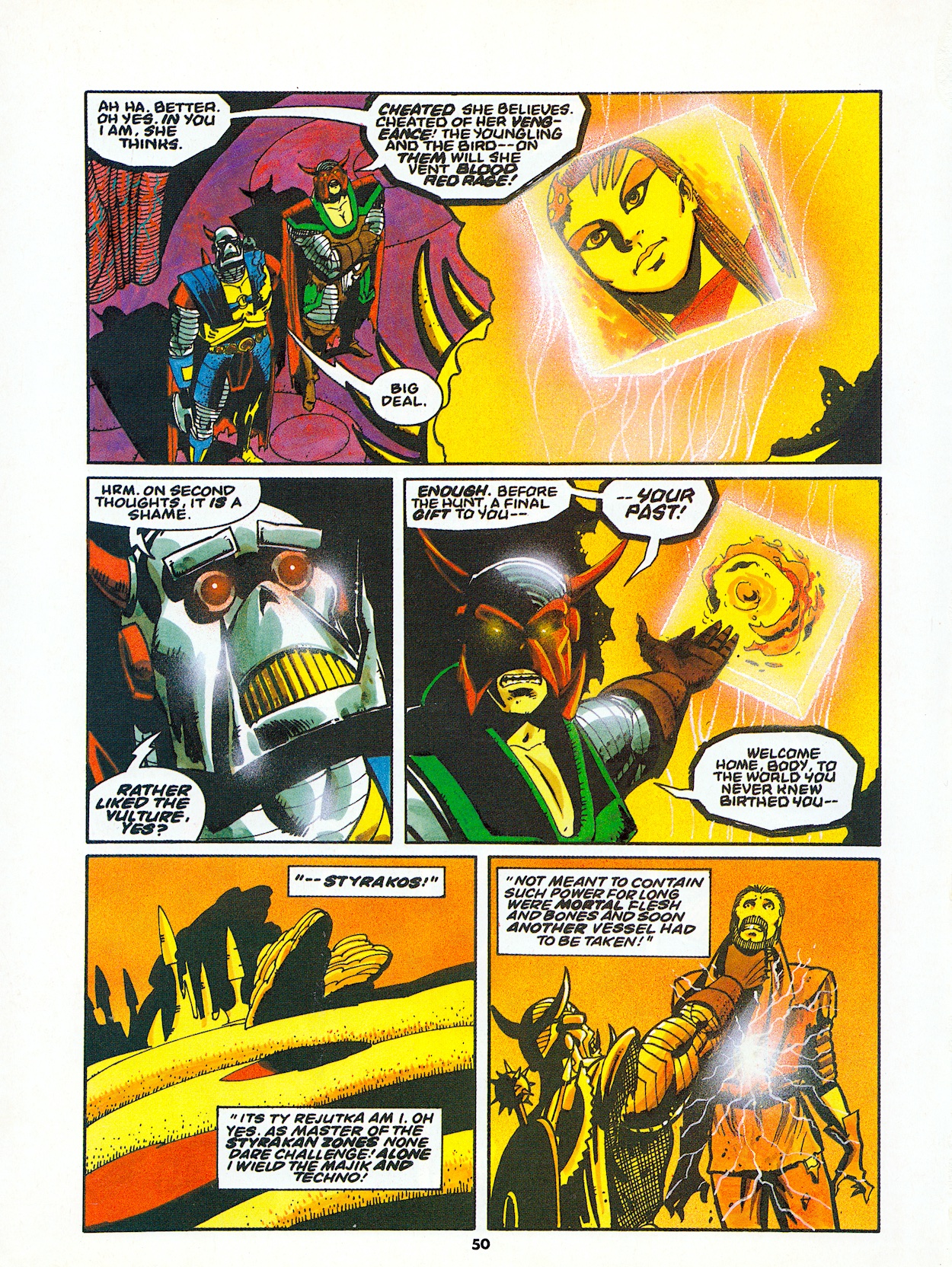 The story culminates in a chase echoing that from the beginning, only with Death’s Head as the one being chased and taunted. This creature also has control over the land in this realm, which is split into ‘magik’ and ‘techno’ sectors. In each he can realign his powers to shape the ground and use it to attack his victims, and he almost destroys Death’s Head by doing so. However, he cannot control the borders between these sectors or when they change from one to the other independently.