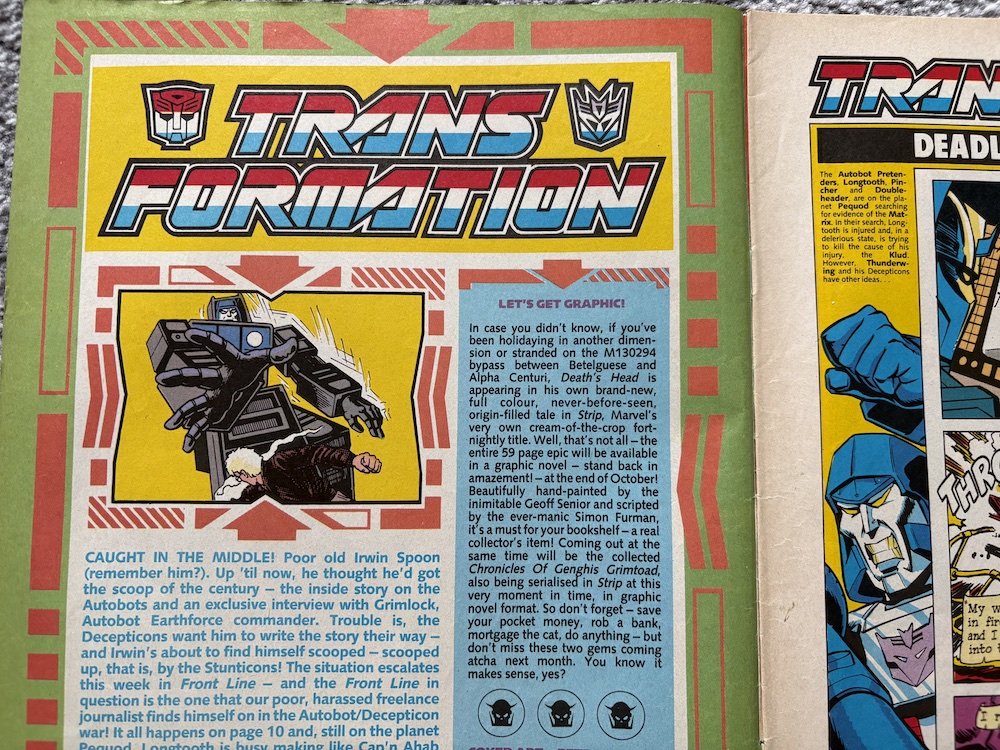 This week back in 1990 the editorial in Marvel UK’s Transformers announced the exciting news that Death’s Head was finally back. Not in a reprint of a previous story (something they still liked to hype) but a brand new graphic novel. In reality it collected together his run from Strip comic, and this is the final piece of the jigsaw for the blog’s real time read through of the original incarnation of the character.